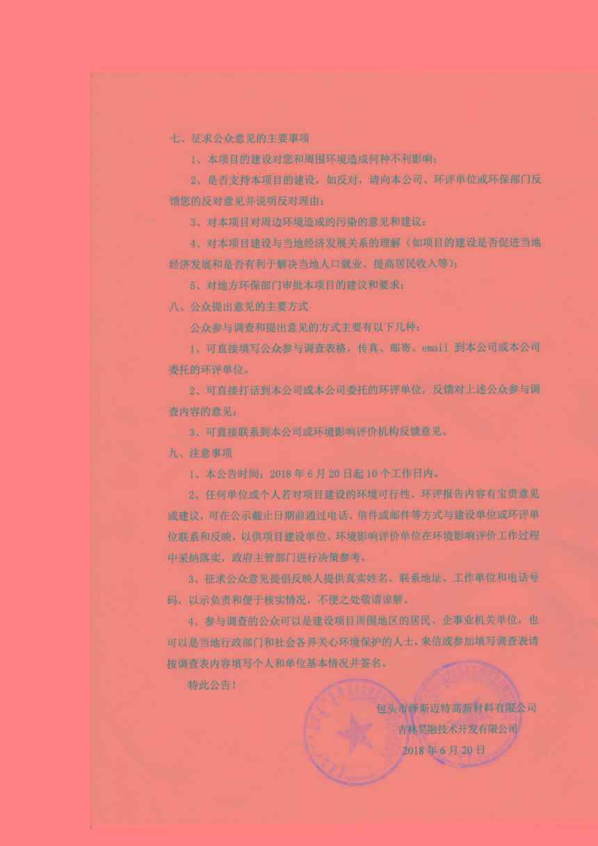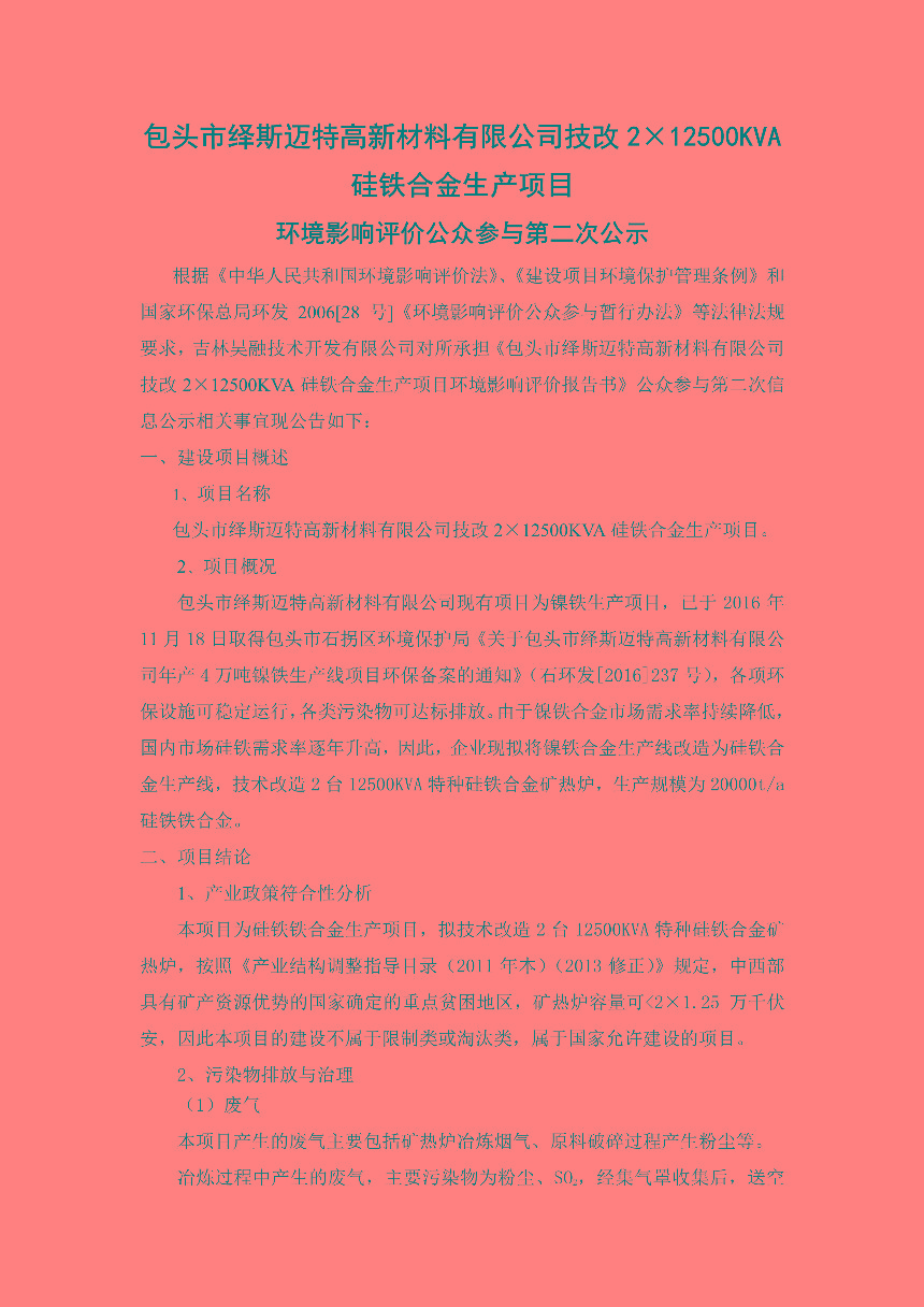 包头市绎斯迈特高新材料有限公司技改2X12500KVA硅铁合金生产项目环境影响评价公众参与与第二次公示