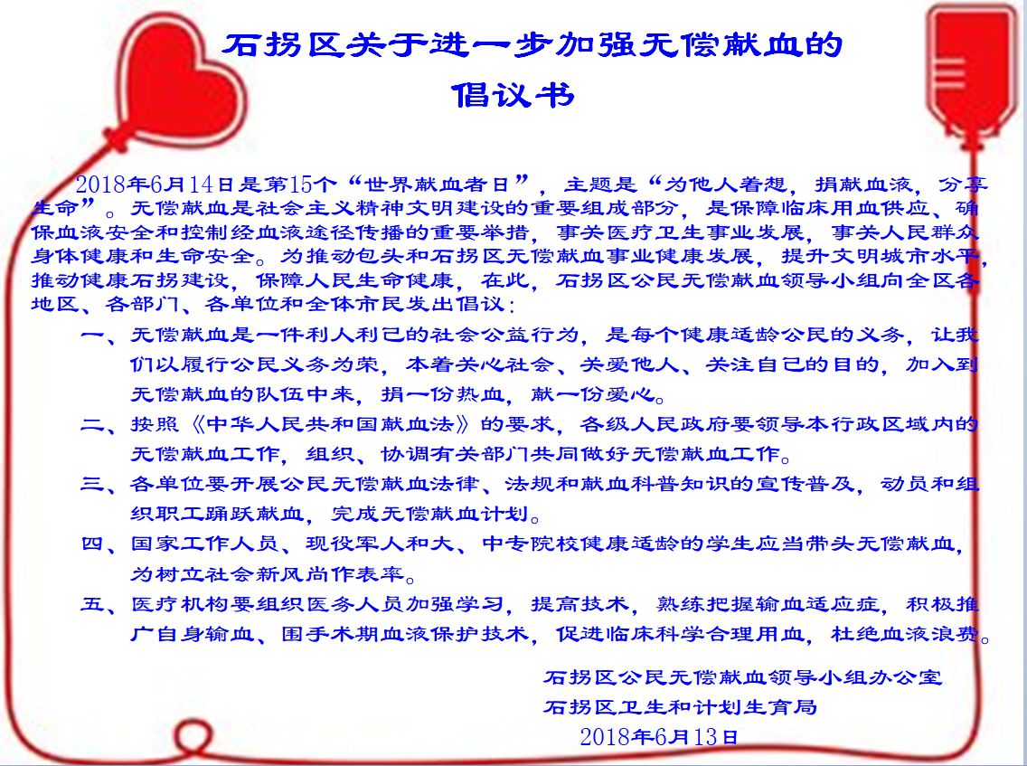 石拐区关于进一步开展无偿献血的倡议书